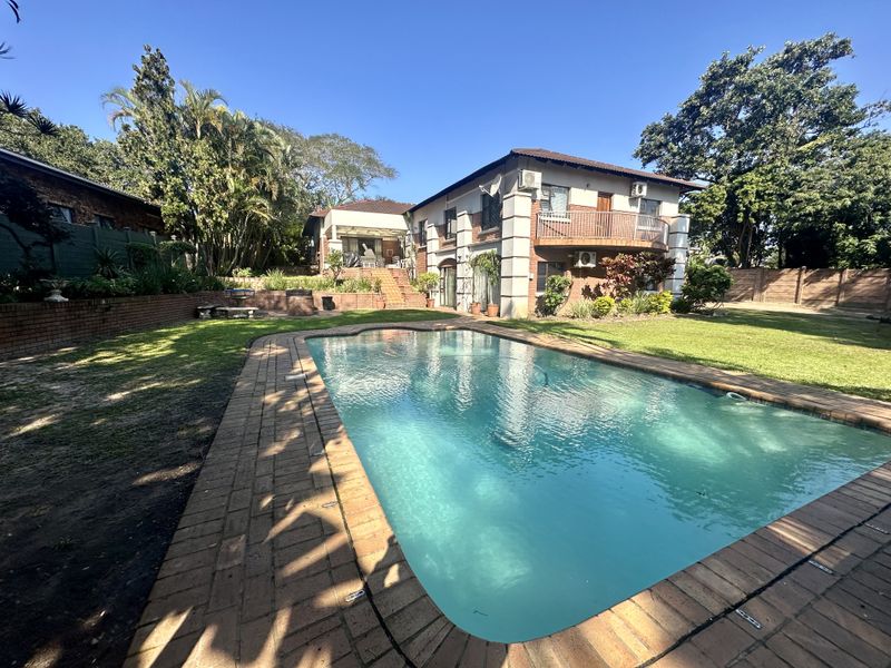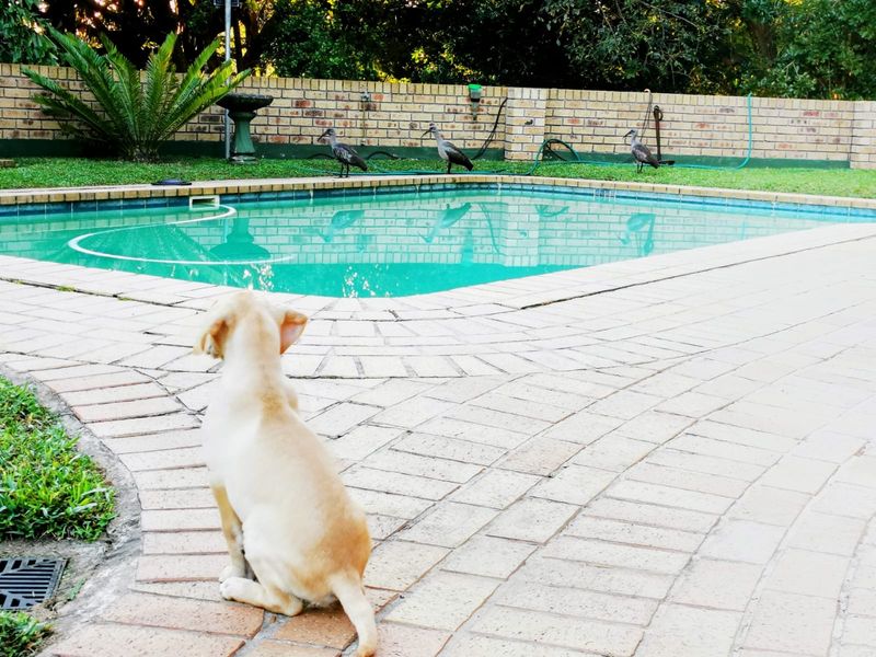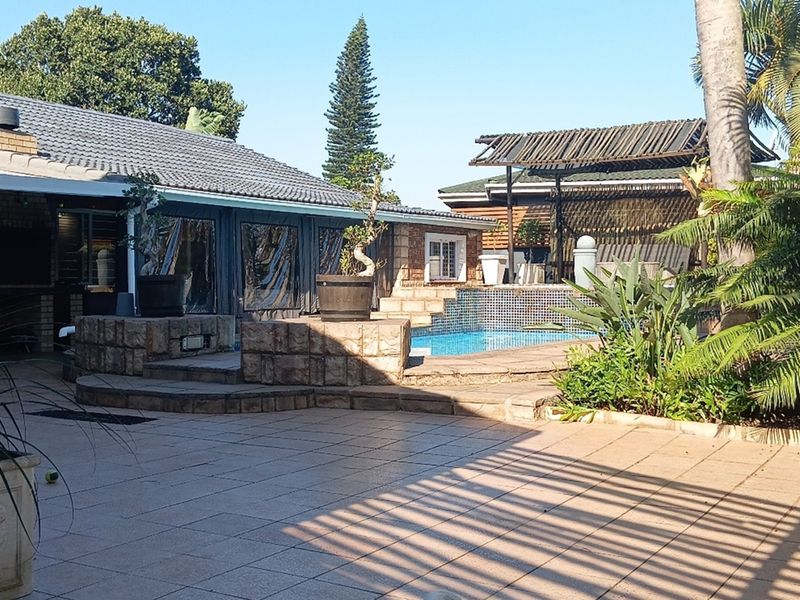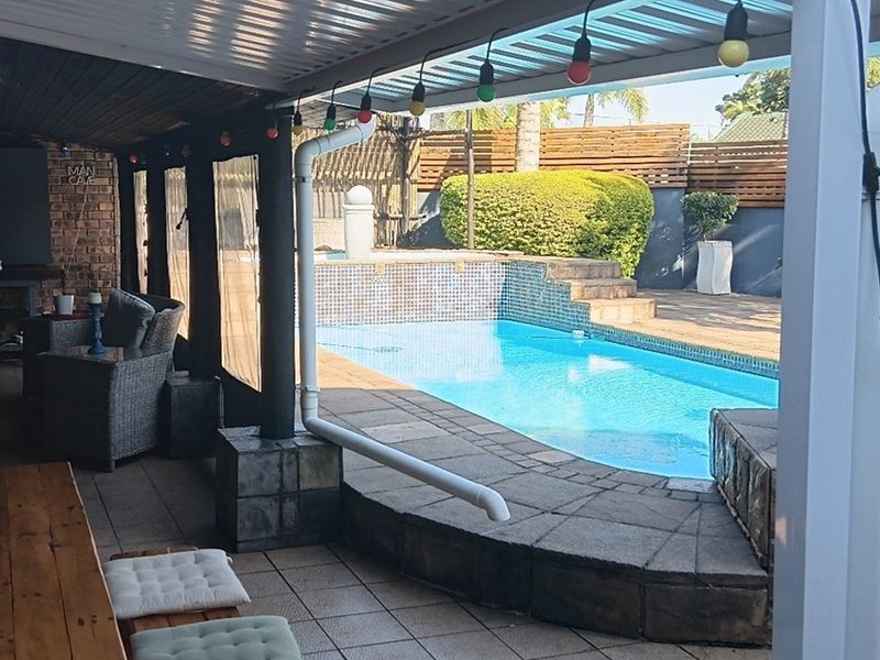 Entertainer's haven in sought-after Meer En See, Richards Bay — easy access to schools and shops. Patio with built-in braai overlooks pool; includes 4-bed main house plus 1-bed flatlet.