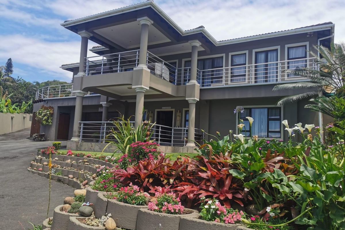 Coastal family retreat in Scottburgh with panoramic ocean views, private garden and pool, versatile flatlet, solar-powered efficiency — five bedrooms, 4.5 bathrooms and six-car garage.