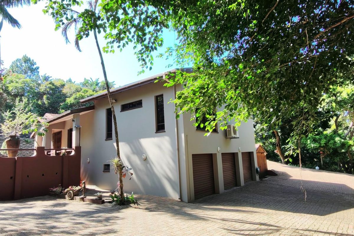 Tropical coastal living minutes from the Indian Ocean in Southbroom, KZN, set on 2000 m² of mature gardens with a covered veranda for alfresco dining; four bedrooms, three bathrooms, three automated garages.