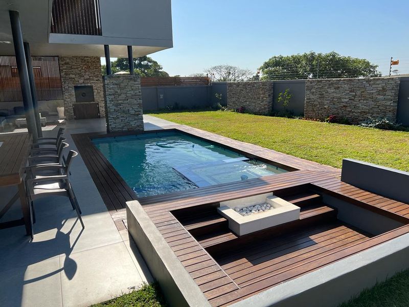 Relaxed coastal estate living in Izinga Estate, Umhlanga — light-filled contemporary home with chef’s kitchen and covered patio flowing to manicured garden and jacuzzi. Four bedrooms, three bathrooms.