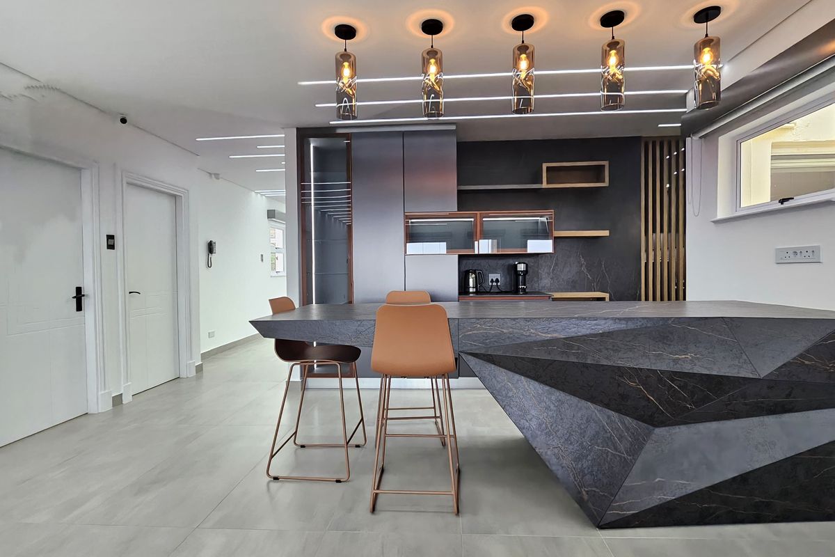 LAN ports in the study and TV points for fast, reliable internet. Study with stone countertops and multiple plug points – perfect for remote work or creative projects.