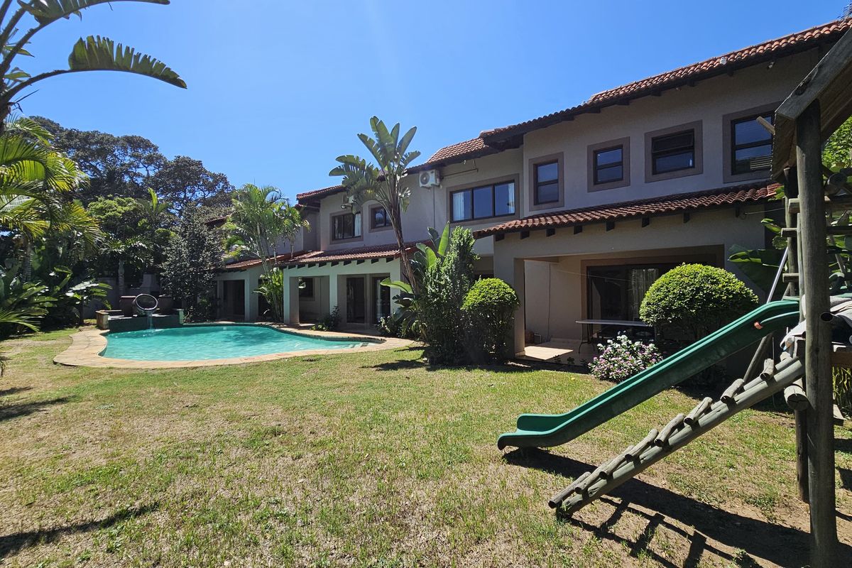 Coastal family living in La Lucia: elegant double-storey home with private garden and pool, modern kitchen and three living areas, four en-suite bedrooms and six covered parking.