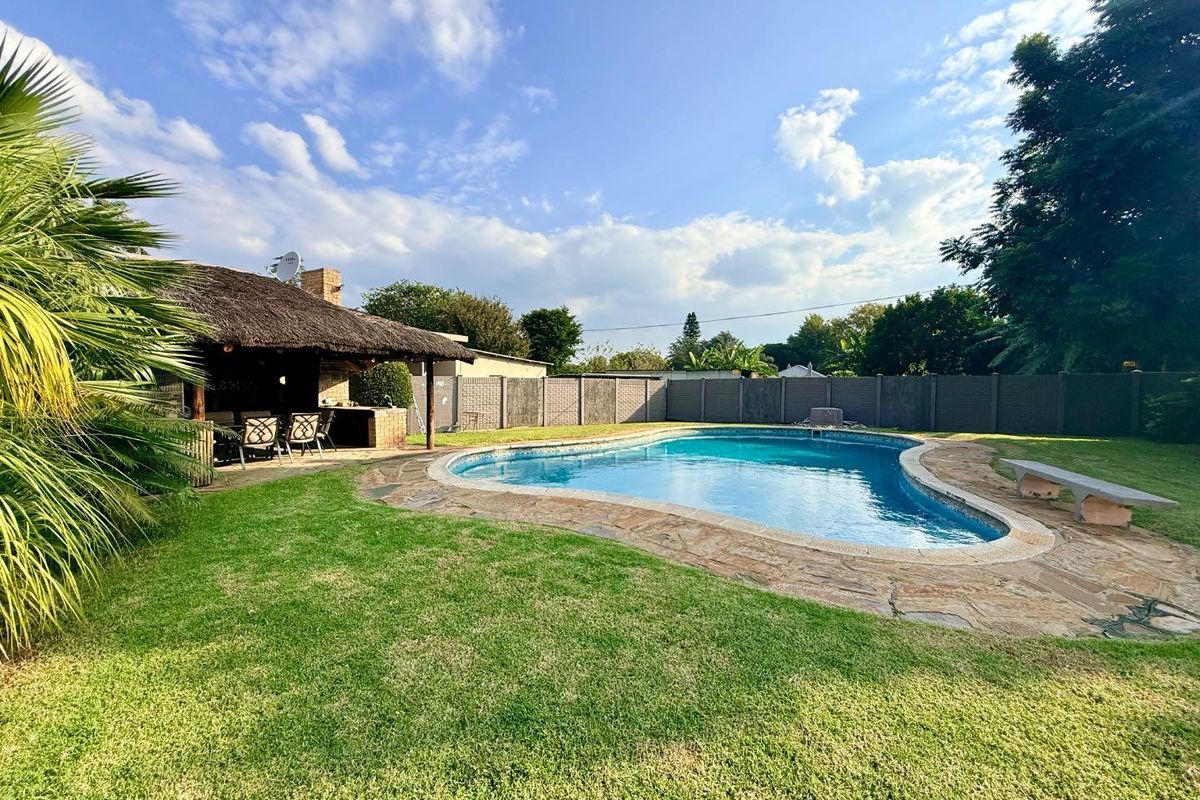 Designed for entertaining, the property boasts a large thatched entertainment area with a built-in braai, overlooking a spacious swimming pool — perfect for hosting family and friends.