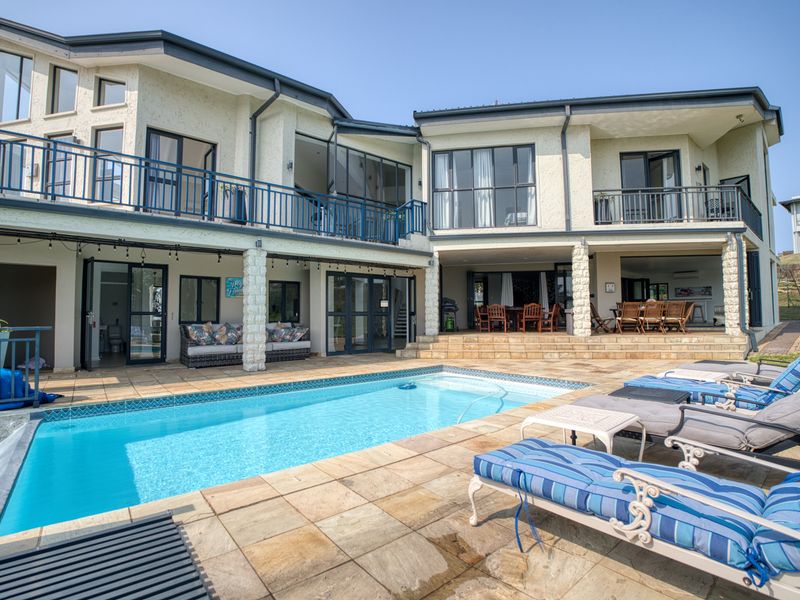 Coastal family retreat in secure Nkwazi Ridge Estate with sweeping sea views, expansive verandas and a private rim-flow pool — seven bedrooms, five bathrooms and double garage.