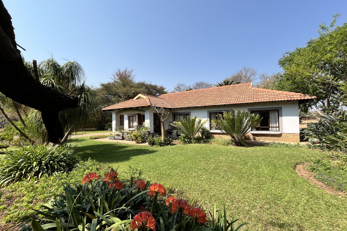 Ceiling fans are installed throughout the home to maintain comfort during warmer months. Step outside to a covered patio overlooking lush, landscaped gardens and the surrounding bushveld—an idyllic setting for relaxation or entertaining.