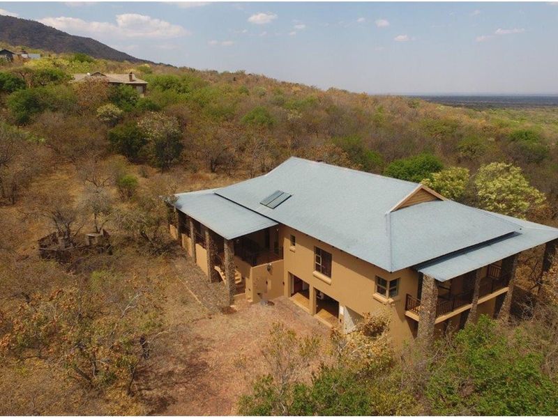 Perched on a mountain in Highlands Wilderness Estate near Bela-Bela, experience panoramic Limpopo Bushveld views, boma, deck and included game-viewing vehicle — four en-suite bedrooms.