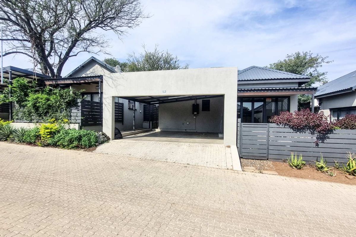 Relax in secure Zandspruit Valley living with open-plan flow and stacking doors to a covered patio and private garden; two bedrooms, two bathrooms and double carport.