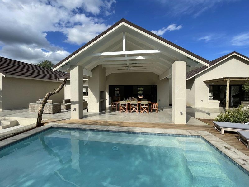 Wake to Big 4 wildlife and bushveld views in Moditlo Wildlife Estate, seamless indoor-outdoor living with pool and expansive decking — three bedrooms, three bathrooms, double carport.