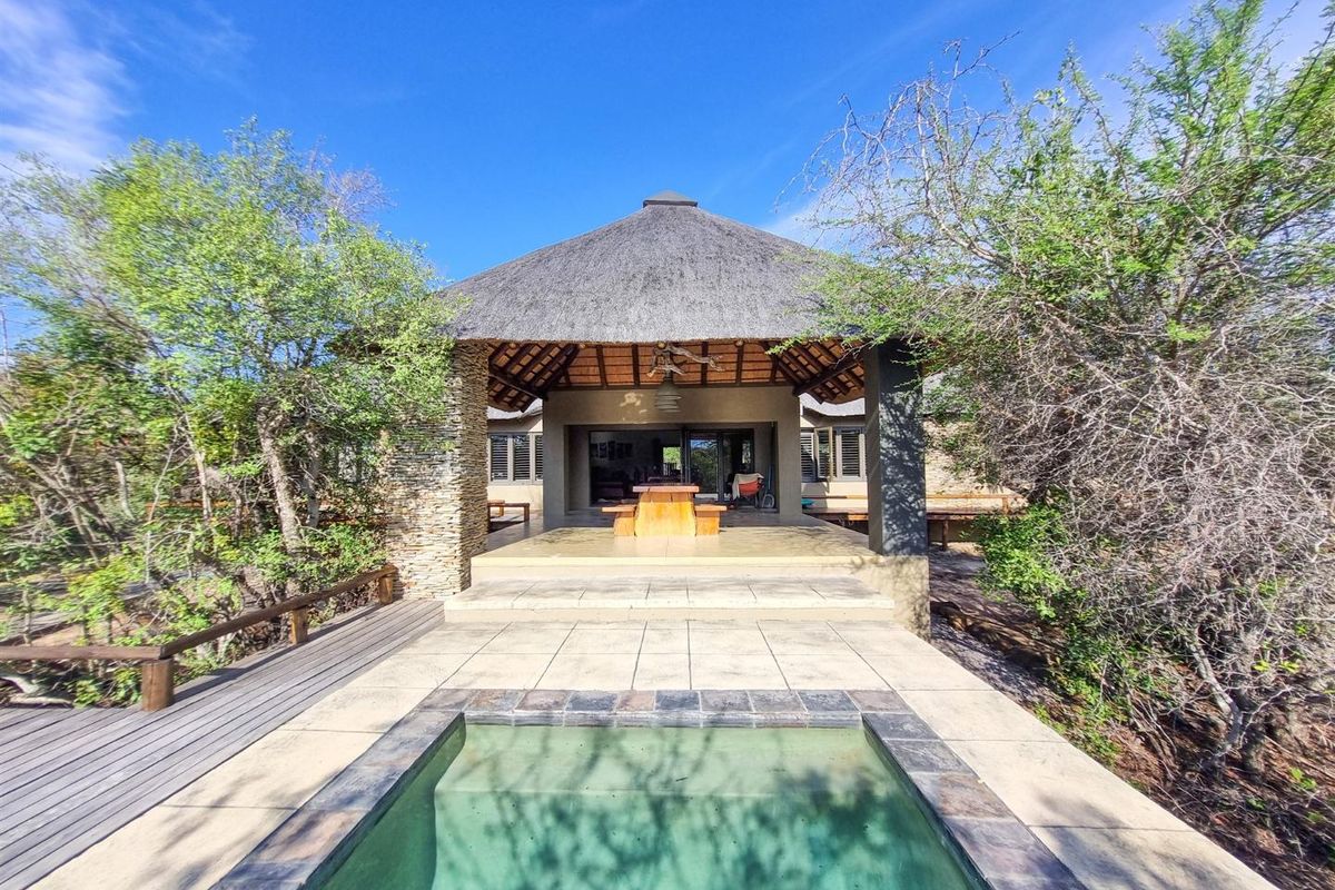 Bushveld retreat in Moditlo Estate with elevated views over plains and distant mountains, featuring a covered patio, pool and boma for alfresco entertaining — three bedrooms, three bathrooms, double carport.