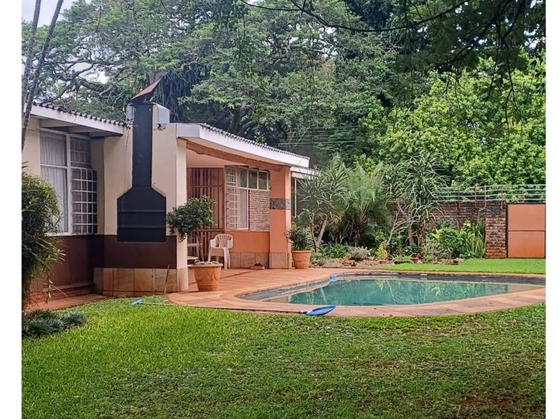 Generous family retreat in a peaceful setting with landscaped garden, sparkling pool and garden store; modern open kitchen, ample parking, borehole, five bedrooms and four bathrooms.