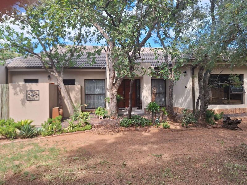 Enjoy relaxed Bushveld living in Koro Creek Golf Estate, Waterberg, with roaming wildlife, covered patio with indoor braai and lush garden — three bedrooms, 2.5 baths, double garage.