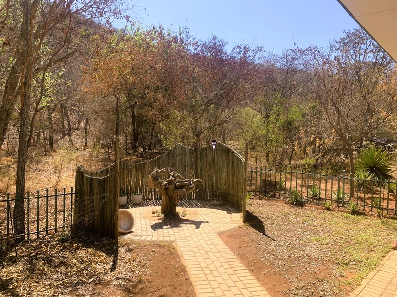 Enjoy relaxed Bushveld living in Koro Creek Golf Estate, Waterberg, with roaming wildlife, covered patio with indoor braai and lush garden — three bedrooms, 2.5 baths, double garage.