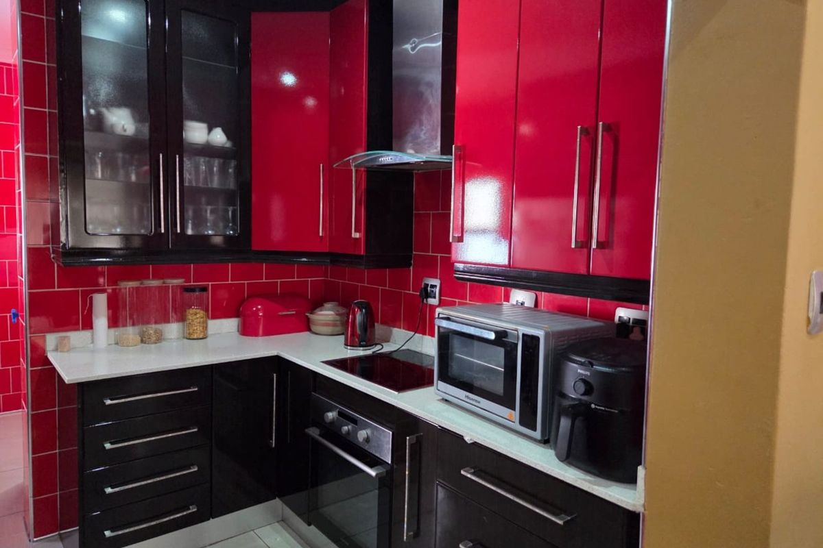 The living areas are designed for both entertaining and everyday comfort. A spacious dining room flows effortlessly into a welcoming living room, while the modern red kitchen is sure to impress with its bold design and separate scullery for added functionality.