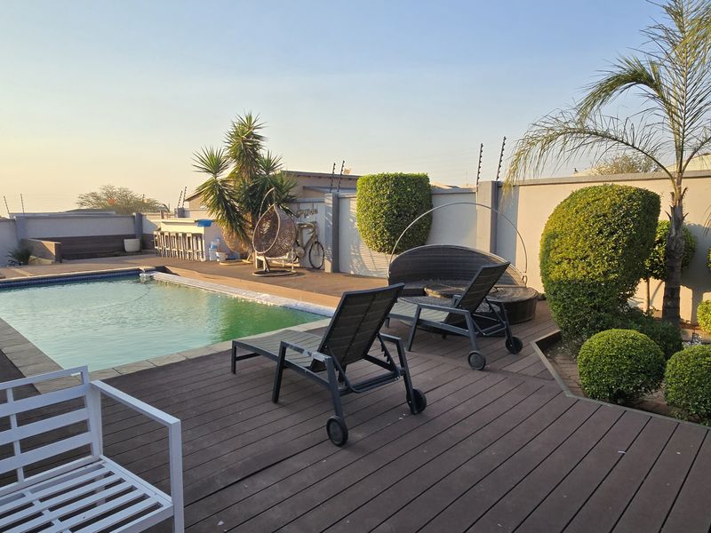 Live large in leafy Bendor Park, Polokwane — expansive grounds and sweeping neighborhood views with entertainment lapa, pool and jacuzzi, quartz kitchen, plus eight bedrooms and eight bathrooms.