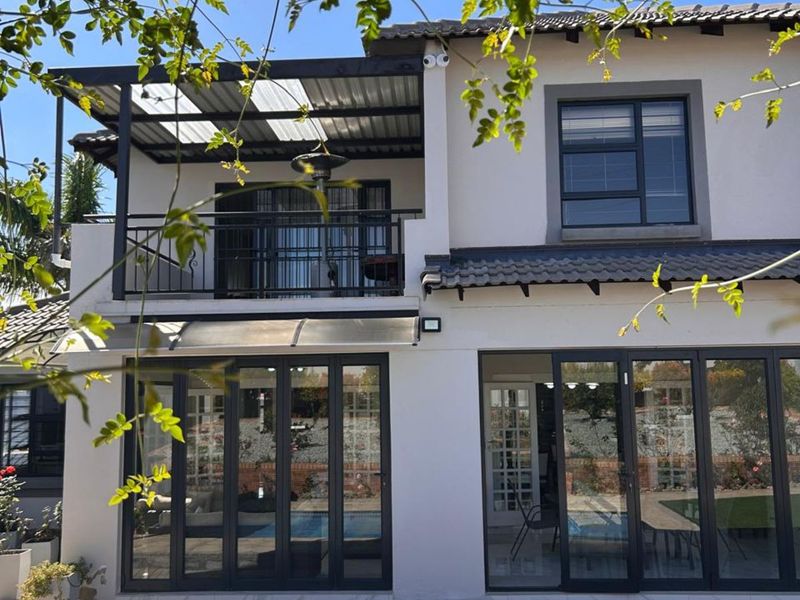 Entertainer’s dream for family living and remote work, set in a luscious garden setting with enclosed lapa and pool, spacious kitchen island, five bedrooms and multiple en‑suite bathrooms.