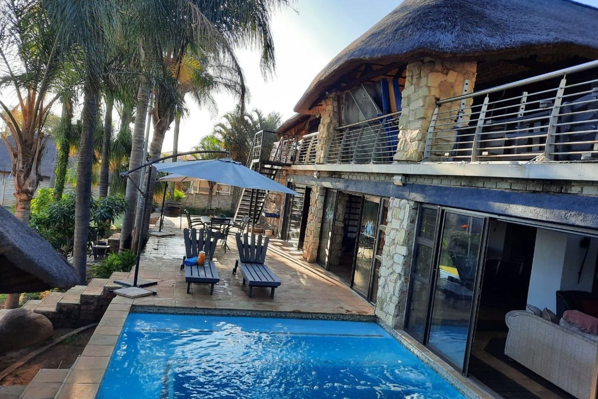 The entire home has been recently retiled to create a uniform, elegant finish; the bathrooms have also been newly retiled. Outdoors, an established garden with mature palm trees surrounds a granite swimming pool and attractive deck area, with a separate jacuzzi for relaxation. A JoJo tank and borehole provide reliable water supply. Security is comprehensive, and parking includes two garages plus a double carport with space for 6–8 vehicles.