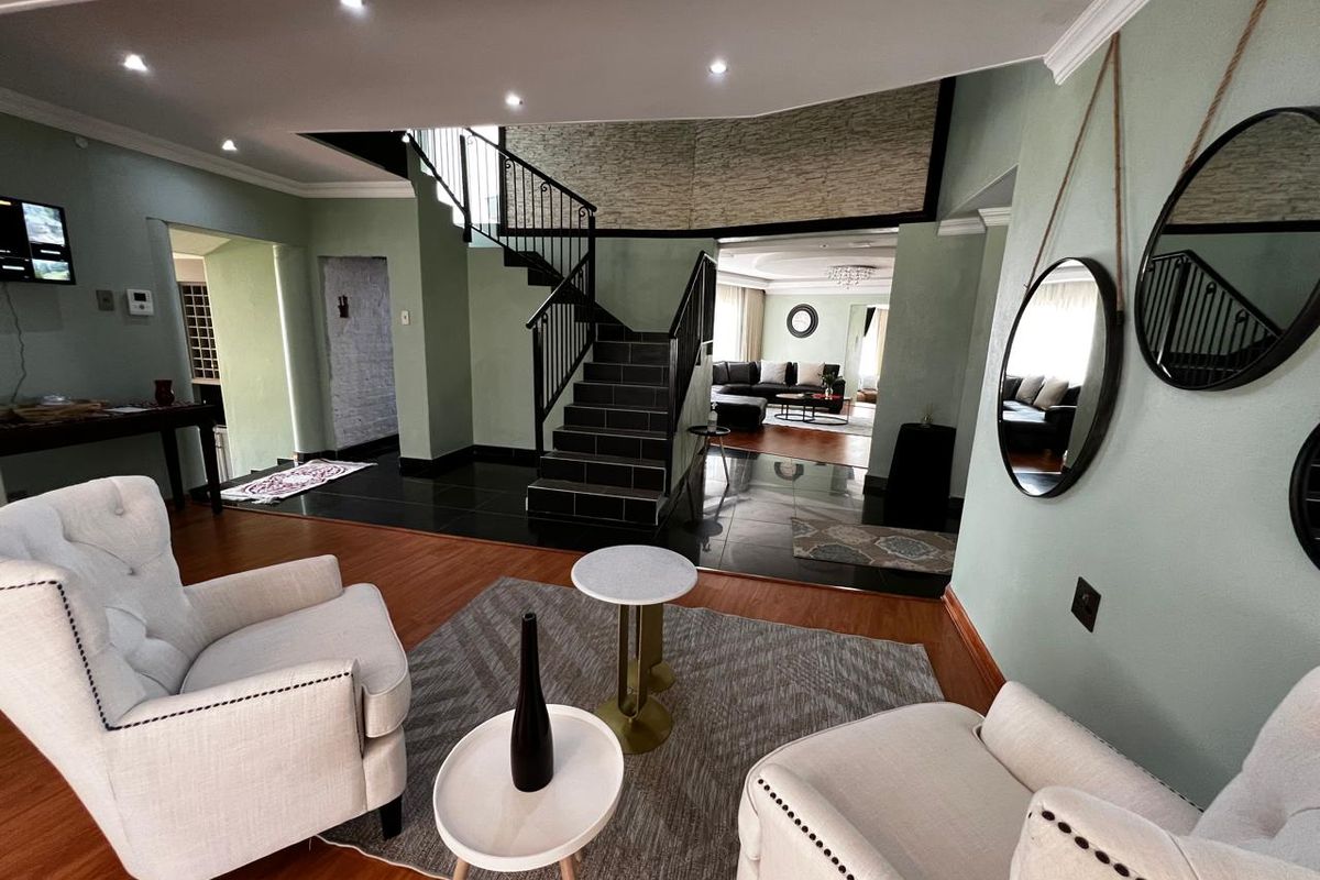 Effortless family living and entertaining on a generous 2052 m², quiet leafy plot — indoor braai flowing to covered boma and pool. Seven bedrooms, six bathrooms, four garages.