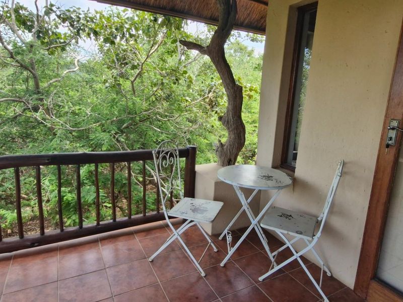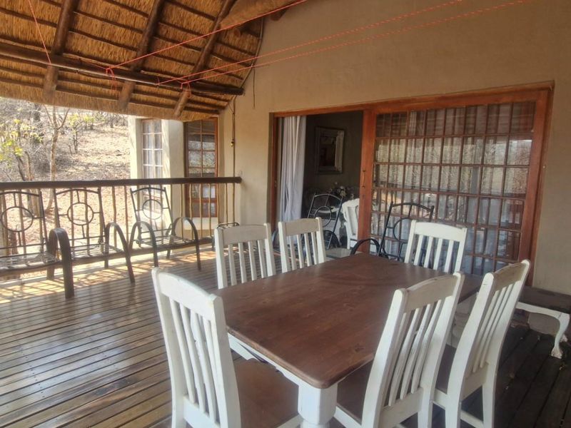 Enjoy bushveld living with uninterrupted greenbelt views and total privacy on a spacious covered deck; open-plan wooden interior, two bedrooms and one bath, covered parking and boma nearby Leeupoort amenities.