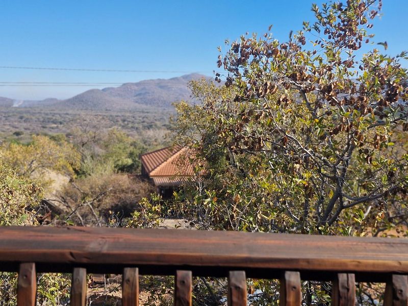 Elevated bushveld retreat with panoramic Waterberg views and wraparound deck, private boma for fireside gatherings, versatile layout including independent lower-level wing — four bedrooms, three bathrooms.
