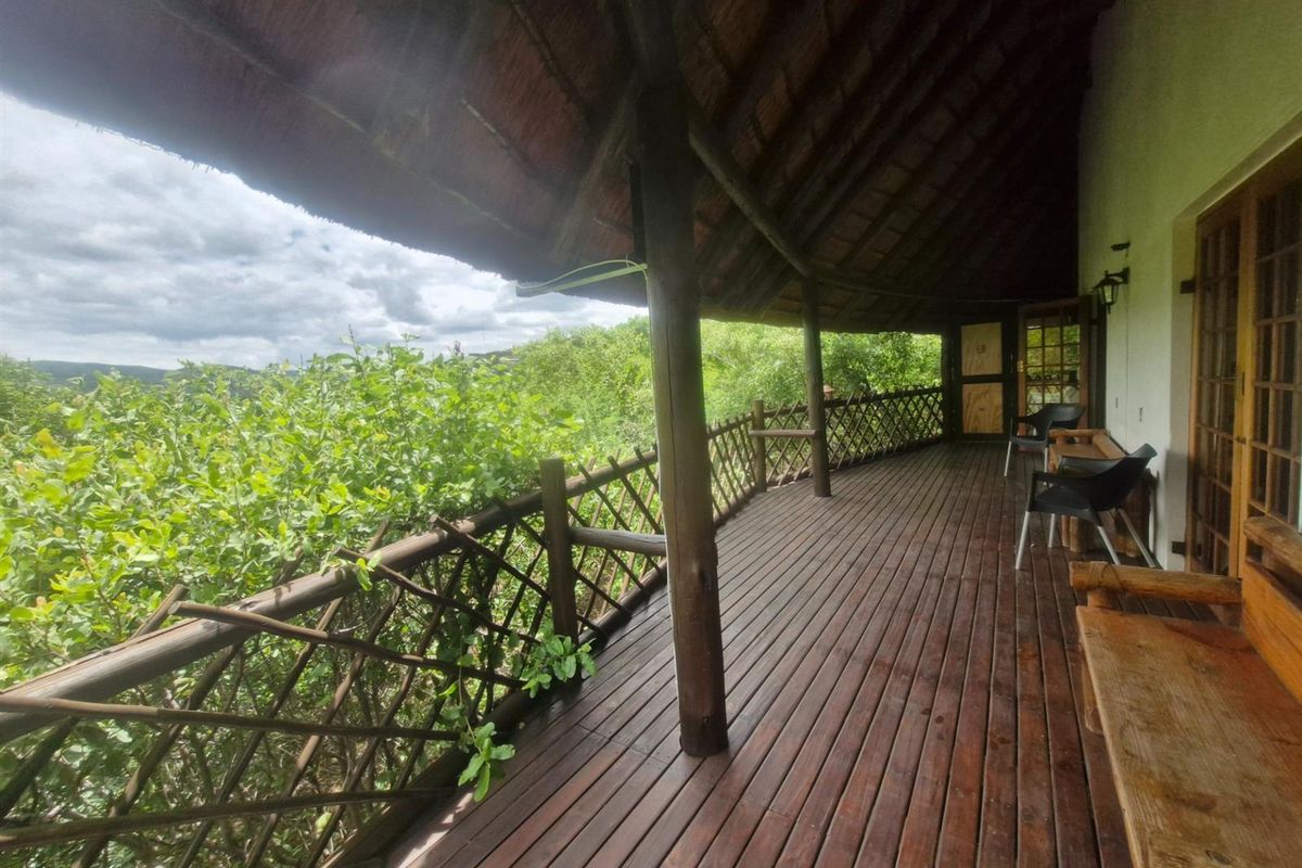 Elevated bushveld retreat with panoramic Waterberg views and wraparound deck, private boma for fireside gatherings, versatile layout including independent lower-level wing — four bedrooms, three bathrooms.