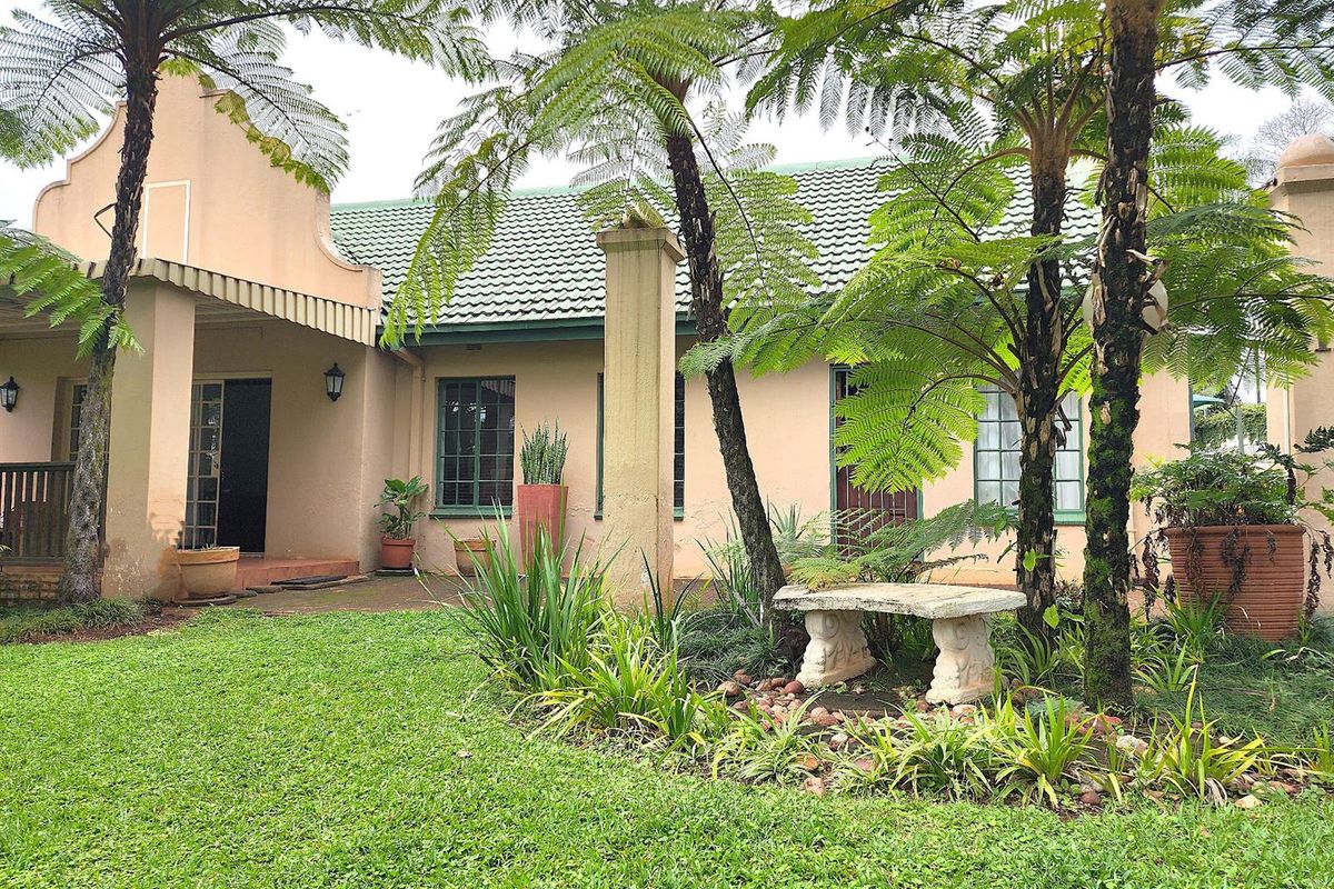 Entertainer's lifestyle in a peaceful suburban setting — covered patio with built-in braai overlooking pool and manicured garden. Includes 4-bed, 3-bath main house and 1-bed flatlet.