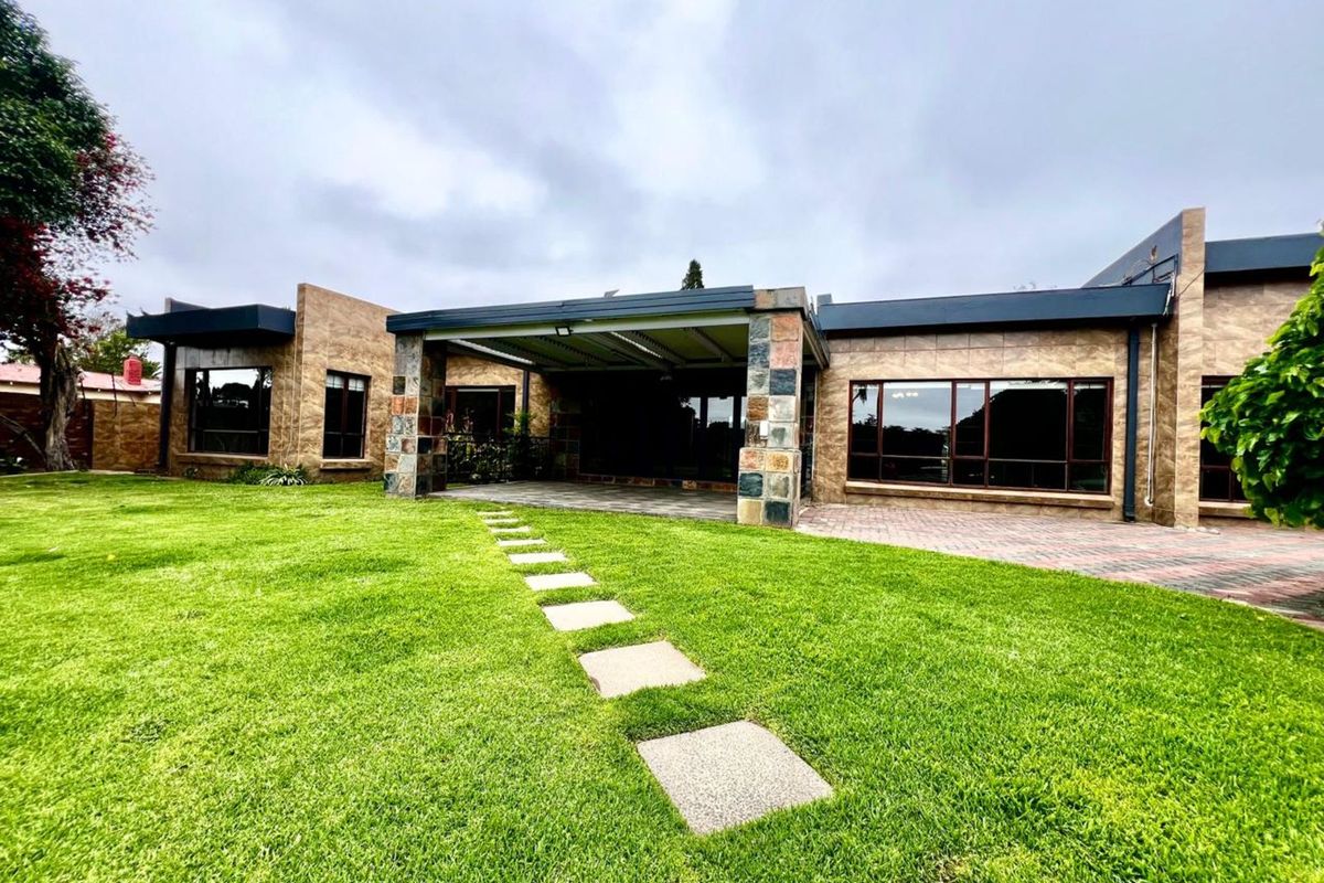 The beautifully landscaped garden surrounds a sparkling fibreglass swimming pool, equipped with a heat pump and safety cover, all set against stylish paving. Thoughtful extras like a borehole, 5000L JoJo tank with electric pump, and a well-equipped domestic quarters (with shower and toilet) add unmatched practicality.