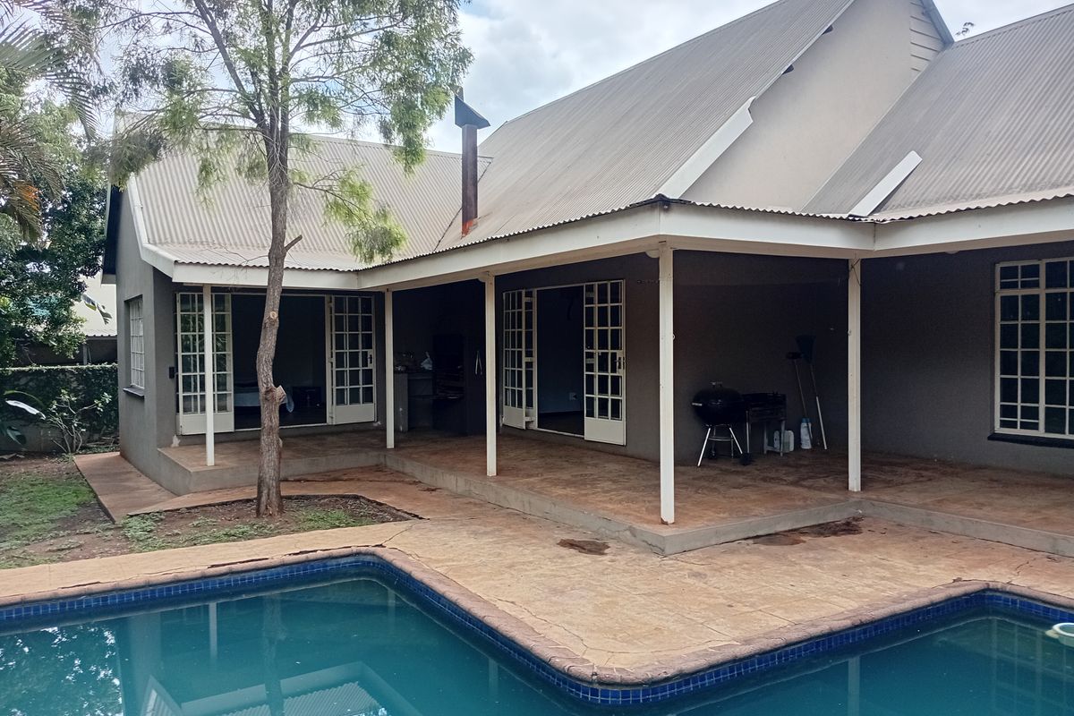 Effortless family entertaining on a corner in Fish Eagle Bend, Malelane — deep verandah overlooking pool and manicured garden, open-plan kitchen/bar, three bedrooms, two bathrooms, double garage.