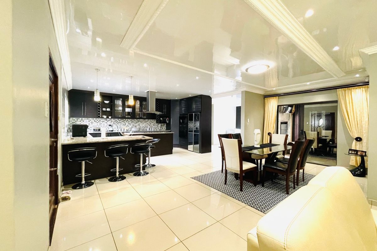 Enter into an open plan setting that seamlessly connects the dark mahogany spacious kitchen with a centre isle, a separate huge scullery/laundry from a comfortable dining area which is conveniently positioned across an enclosed braai area with folding doors as well as a massive lounging room.