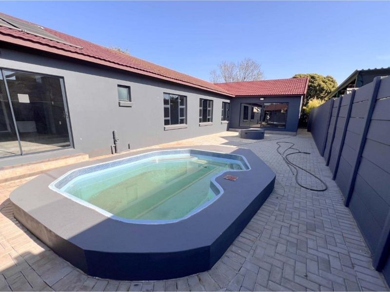 Family-focused home in a quiet, secure neighborhood with pool, two patios (one with built-in braai) and boma for entertaining. Modern matt kitchen, four bedrooms, three baths, double garage.
