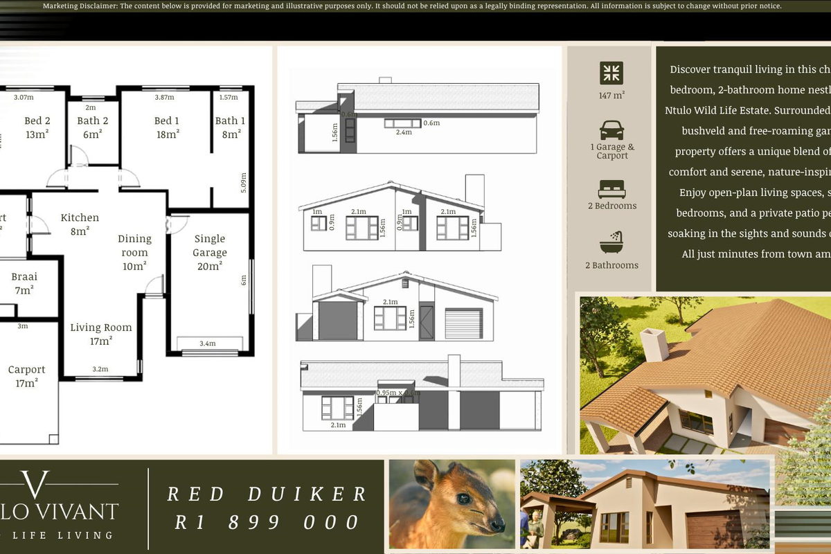 Each building package includes a modern 2-bedroom, 2-bathroom open-plan home designed for effortless living. The spacious layout flows seamlessly from the living area to the kitchen, complemented by a single garage and single carport for added convenience. Type 1-Red Duiker.