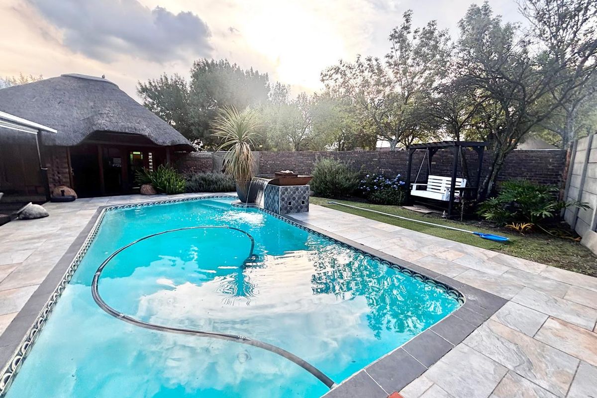 Outdoor entertainment is well catered for with a lapa featuring a built-in braai, a swimming pool, and a fully functional koi pond, creating a relaxing environment for family gatherings and entertaining guests.