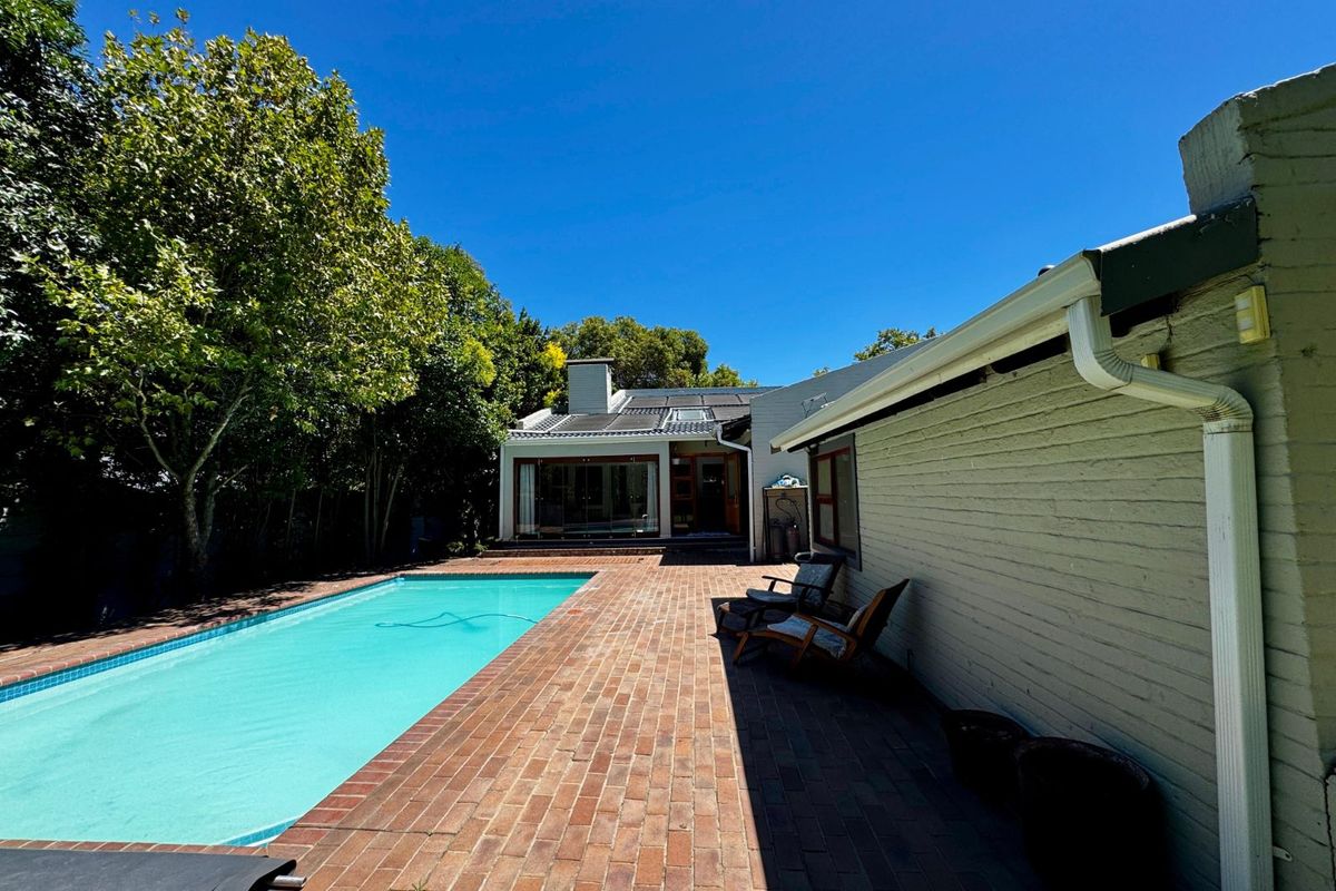 Effortless family living with indoor-outdoor entertaining, built-in braai and pizza oven, pool with safety cover, and direct access to the green strip — six bedrooms, double garage.