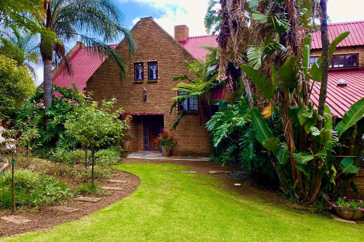 Relaxed French-country farmhouse living set on 1505 m² of mature gardens, with exposed timber beams, a country kitchen with fireplace and loft-style upper level — five bedrooms, three bathrooms, double garage.
