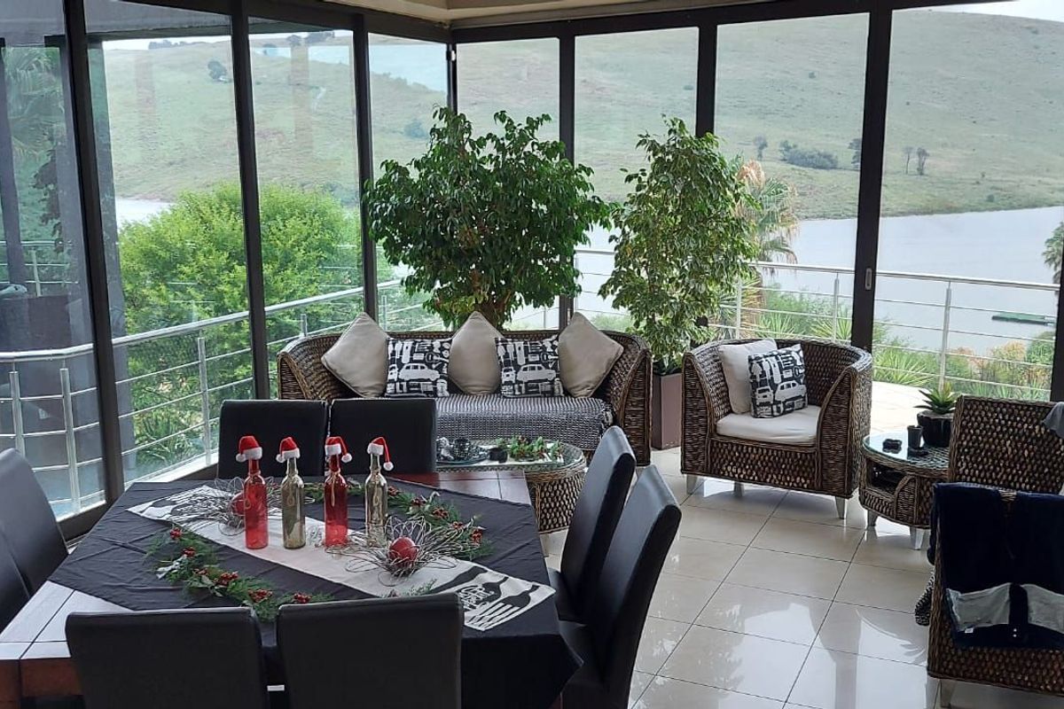 Resort-style waterfront living on Witbank Dam within secure Golden Mile Estate, featuring an operational Sand Bar waterfront lapa with waterslide and a triple-storey main house with five en-suite bedrooms.