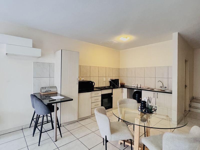 2-bedroom townhouse in gated complex, 1 bathroom, prepaid utilities, single garage, private yard. Levies R800.