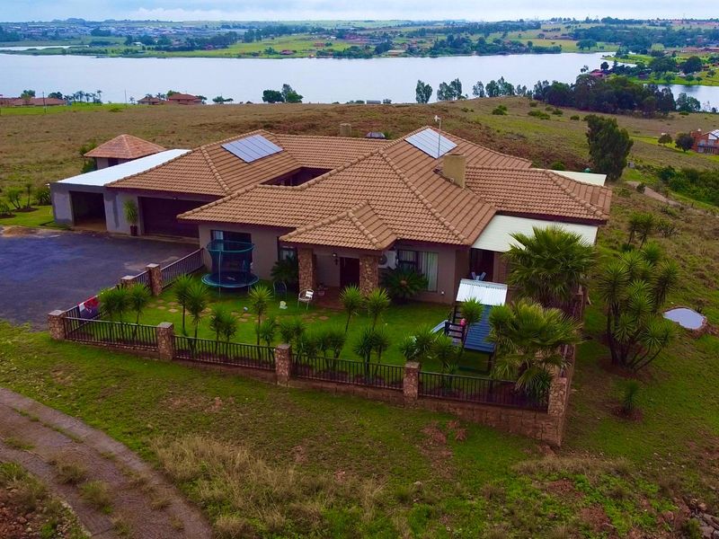 Resort-style living in Golden Mile Estate, Witbank — secure waterfront grounds with expansive 1.7ha, solar-backed power and borehole, enclosed entertainment areas, four bedrooms and double garage.