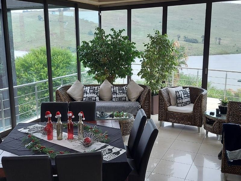 Resort-style waterfront living on Witbank Dam within secure Golden Mile Estate, featuring an operational Sand Bar waterfront lapa with waterslide and a triple-storey main house with five en-suite bedrooms.