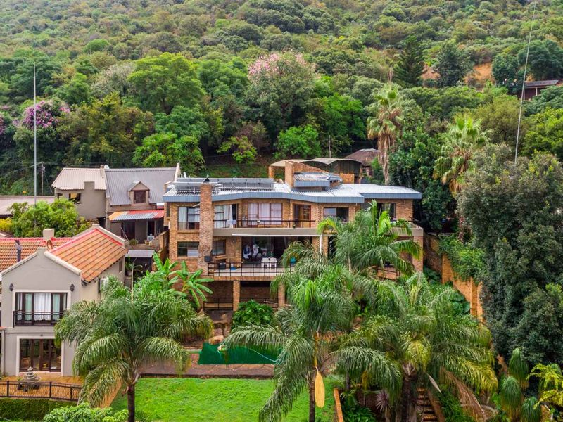 Alfresco living and entertaining on a vast terrace with panoramic Hartbeespoort Dam and mountain views in a secure estate; lodge-like interiors, private balcony master, four bedrooms, two baths, double garage.