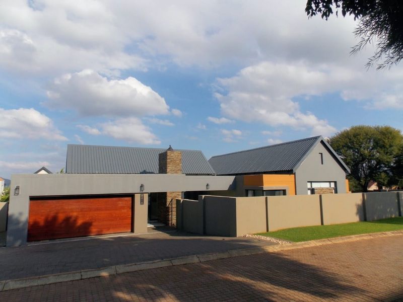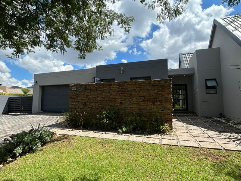Relaxed estate living in Leloko Lifestyle Estate with private pool and warm boma for guests, sleek open-plan kitchen and fireplace; four bedrooms, three baths and double garage.