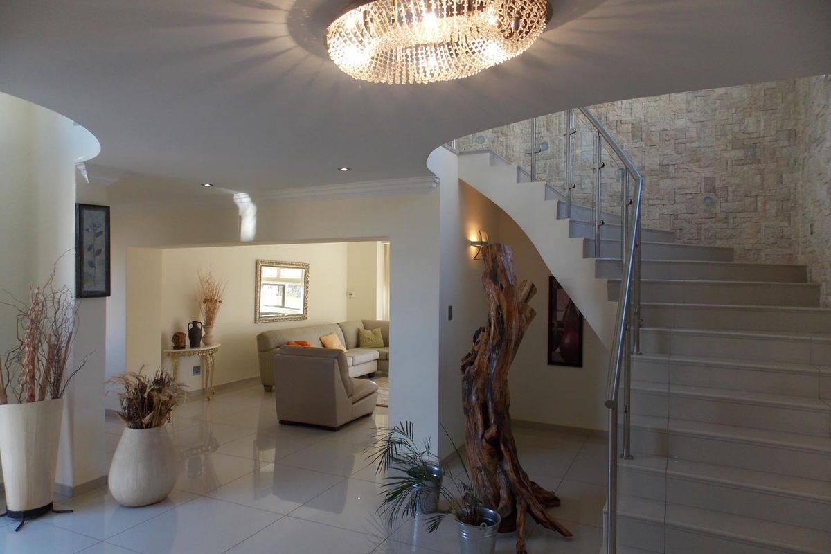 Upstairs you are greeted with another living area and 3 of the bedrooms which all offers en-suite bathrooms and balconies to enjoy the fresh air. The main bedroom also boasts a pajama lounge, perfect to relax in your own space. The property is equipped with a central sound system and underfloor heating. Ample parking is available for extra vehicles and visitors.