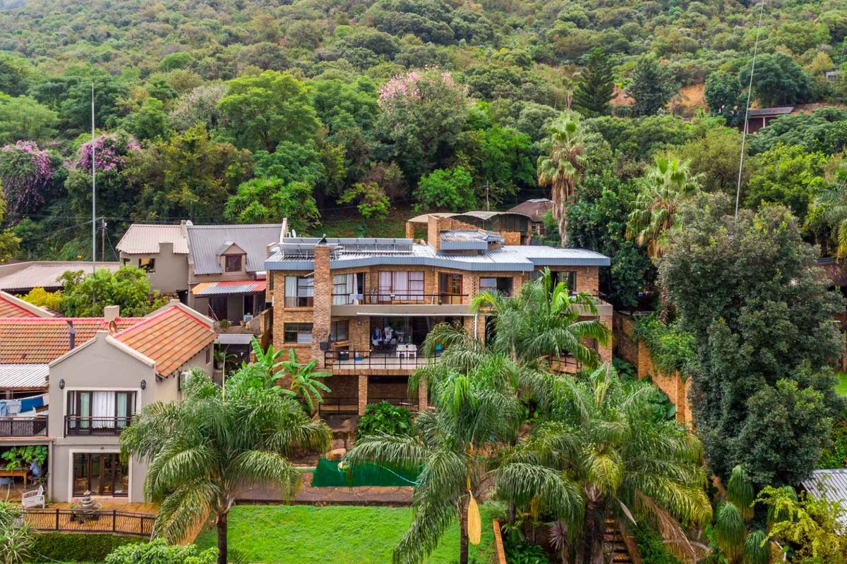 Alfresco living and entertaining on a vast terrace with panoramic Hartbeespoort Dam and mountain views in a secure estate; lodge-like interiors, private balcony master, four bedrooms, two baths, double garage.
