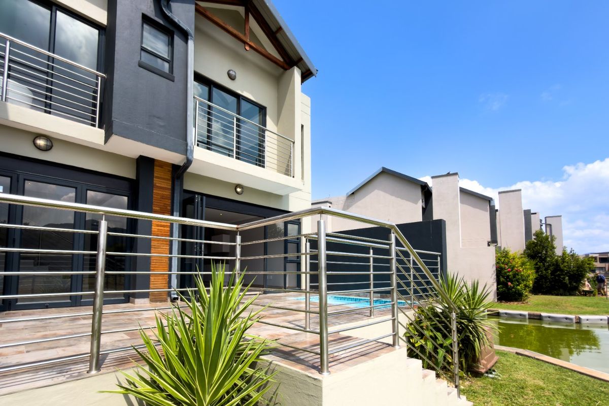 Canal-front lock-up-and-go living with private boat mooring and direct water access near Hartbeespoort Dam, light-filled open plan, covered patio with built-in braai, splash pool, and three en-suite bedrooms.