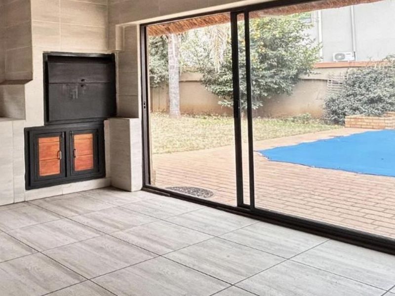 Effortless family entertaining on a generous leafy stand in a peaceful residential area, with covered patio and built-in braai overlooking pool and lush borehole-fed garden. Three bedrooms, two bathrooms.