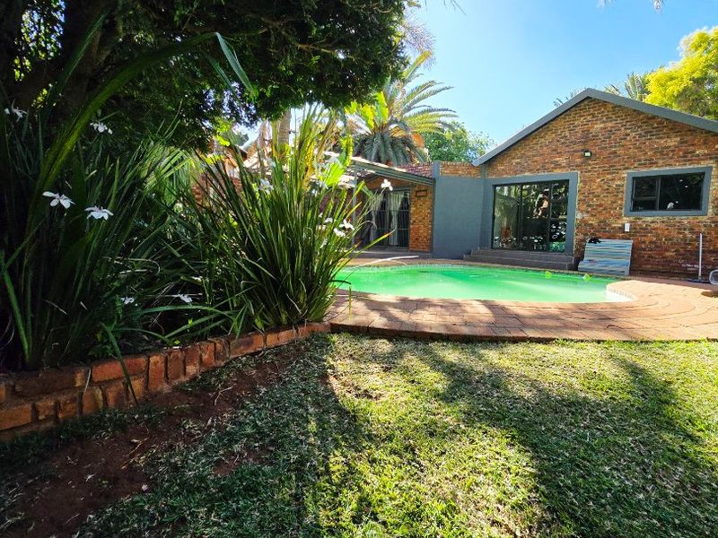 Entertainer's family oasis in prestigious Doringkruin, close to amenities, featuring a private wraparound garden and pool, huge four-vehicle workshop/garage, plus versatile lapa and flatlet.