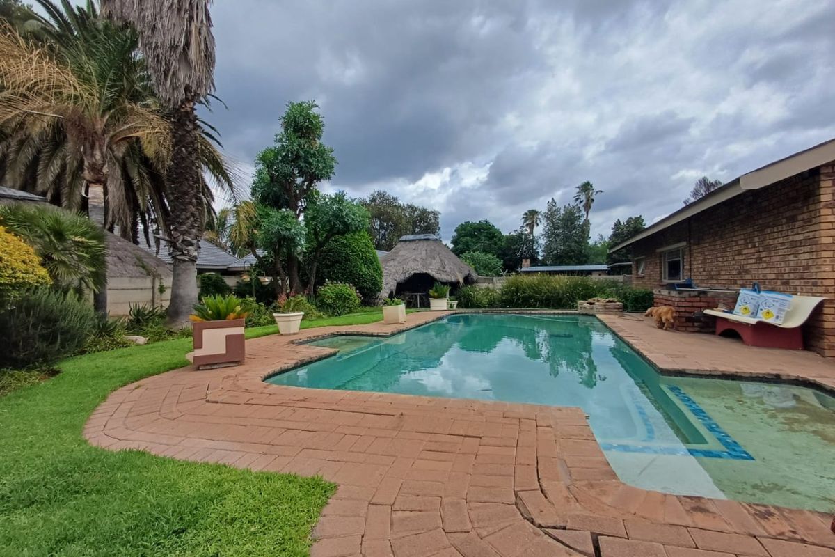 Entertainer's suburban retreat in Flimieda, Klerksdorp — close to schools and shopping — with lapa and pool, manicured garden with borehole and pond, three beds, two baths, double garage.