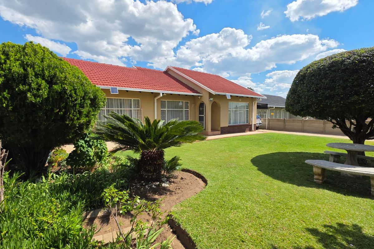 Outside, the property truly shines. A borehole supports the well-maintained garden, while the spacious yard provides plenty of room for children and pets to play freely. There is also ample space available to add a swimming pool, allowing you to further enhance this home’s entertainment potential. The property includes a double garage with thatched roof (requiring some maintenance), an additional carport, and a driveway leading to the back garden, offering convenience and extra parking.