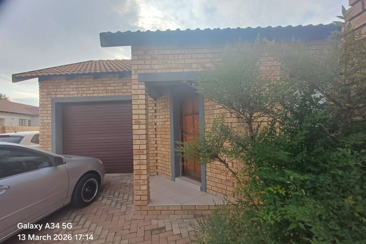 Relaxed, secure suburban living in Meiringspark, Klerksdorp — open-plan kitchen and lounge flowing to a pet-friendly garden with outside braai; enclosed complex with electric fence; two beds, one bath, single garage.
