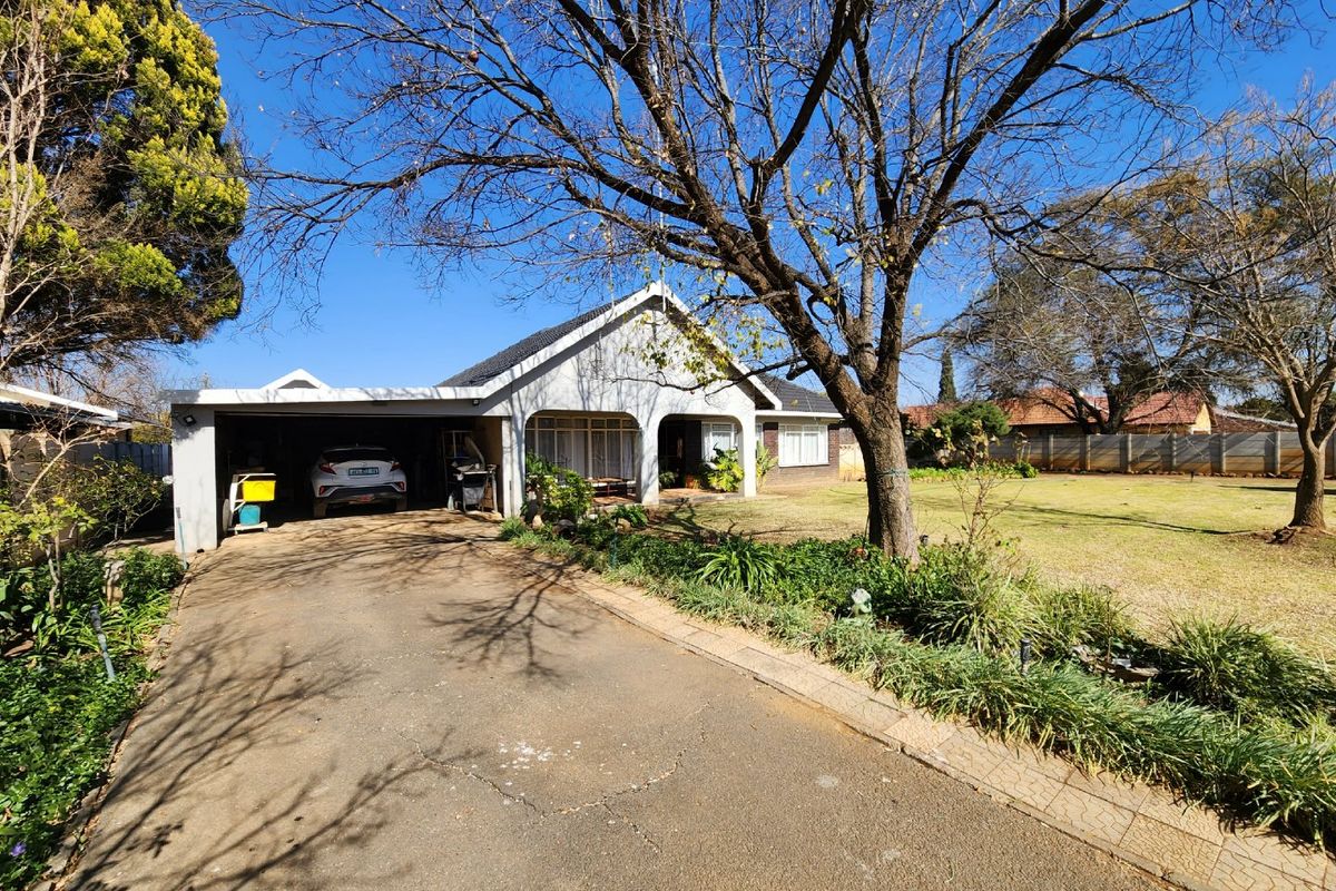 Family living on a leafy Meiringspark street in Klerksdorp, with a huge garden and borehole, open-plan living with TV braai room, four bedrooms, three bathrooms, tandem garage plus two-car carport.