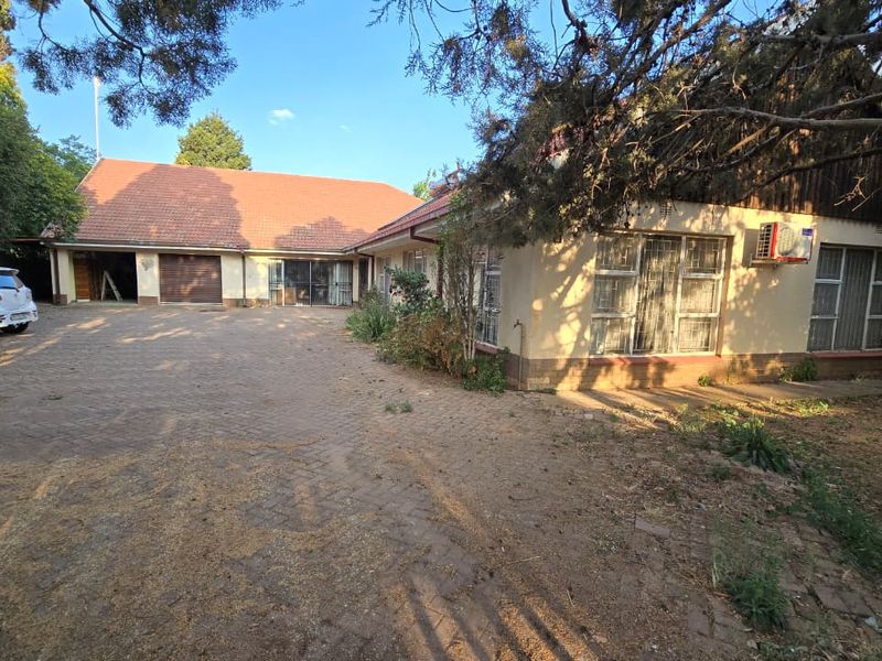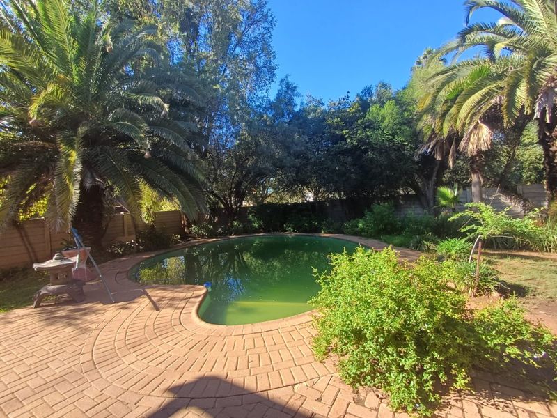 Four-bedroom, two-bathroom home in Oudorp, Klerksdorp with a large yard, swimming pool, double garage, and outside room.