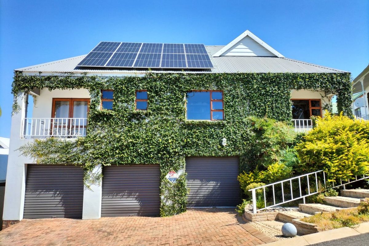 Hilltop living with panoramic Klerksdorp views — relaxed indoor-outdoor entertaining around a built-in braai and water-feature garden; four bedrooms, three bathrooms and three garages.